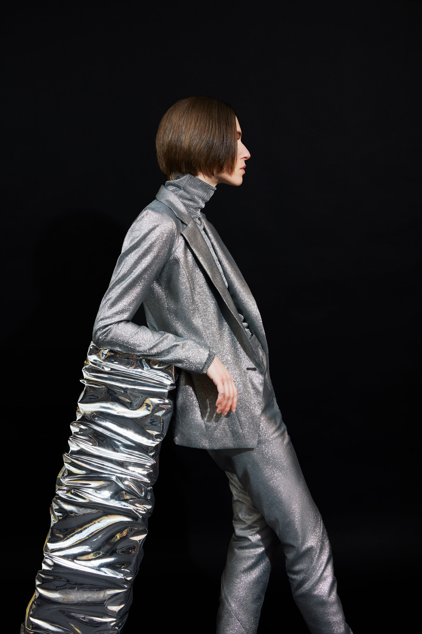 The look is finished with the Pleated Sleeve JacketThe Pleated Sleeve Jacket, that has a stacked layer of pleats at the backside of both sleeves.