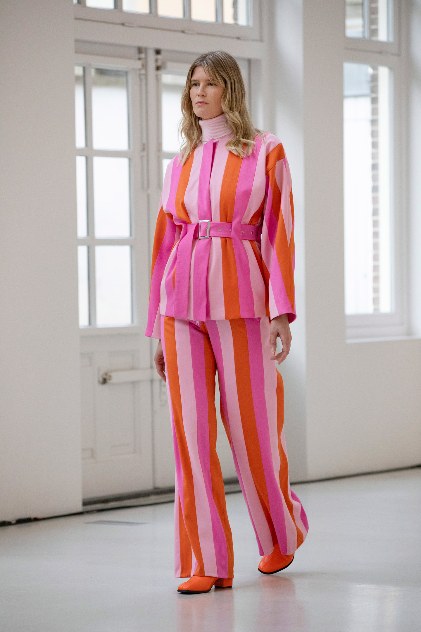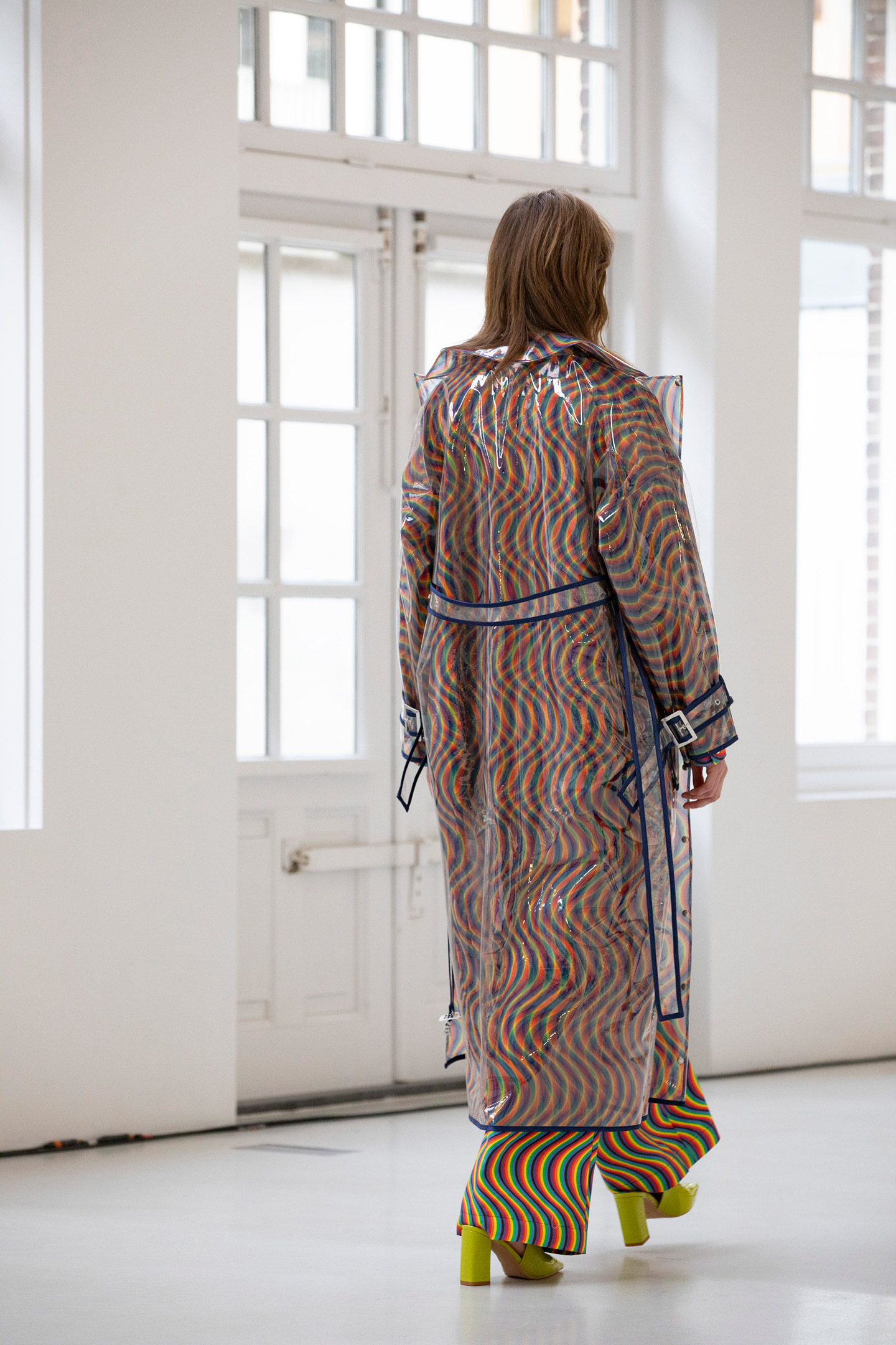 The coat has two hidden side pockets with press buttons and a loose belt of the same material you can tailor the coat as wished. Underneath the coat you’ll find a bright neon yellow turtleneck with long sleeves on a high waist block- shaped pair of dark blue jeans with multiple seams running from top till bottom. The jeans has a big wrap pipe, front pockets and piping pockets in the back. Salon presentation ‘SALON AT SEA’ Collection ‘XO – PART II’