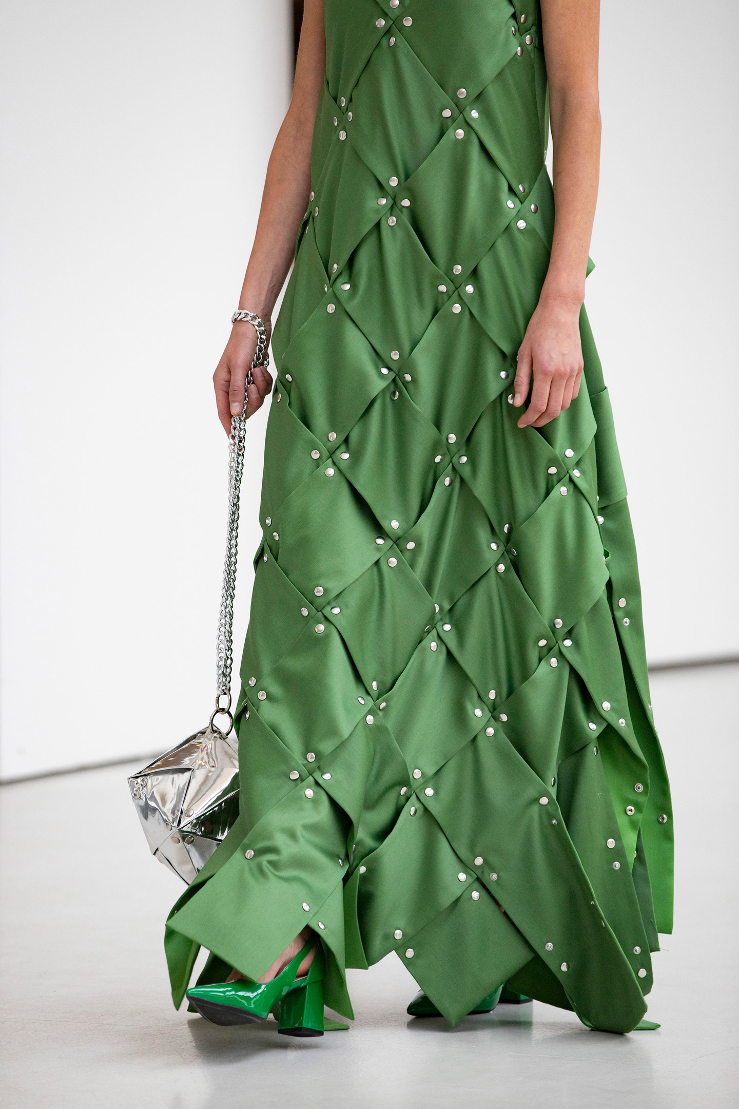 Long sleeveless shirt dress with vertical panels revealing glances of colour from under the woodbine green outer layer in movement. Made from a silk satin with a parrot green silk satin underlayer. Salon presentation ‘SALON AT SEA’ Collection ‘XO – PART II’