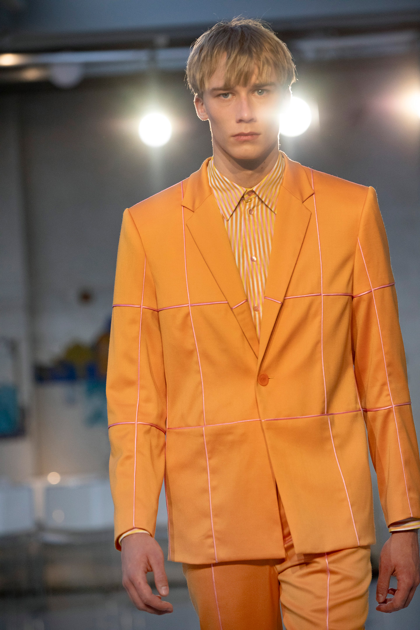 The Pleated Sleeve Jacket has a cropped, boxy fit and has a stacked layer of pleats at the backside of both sleeves. The Peel- off trousers are inspired by a 90's straight fit track suit. These trousers have pleats on both side with hidden golden fabric, and can be exposed wih the help of press buttons.