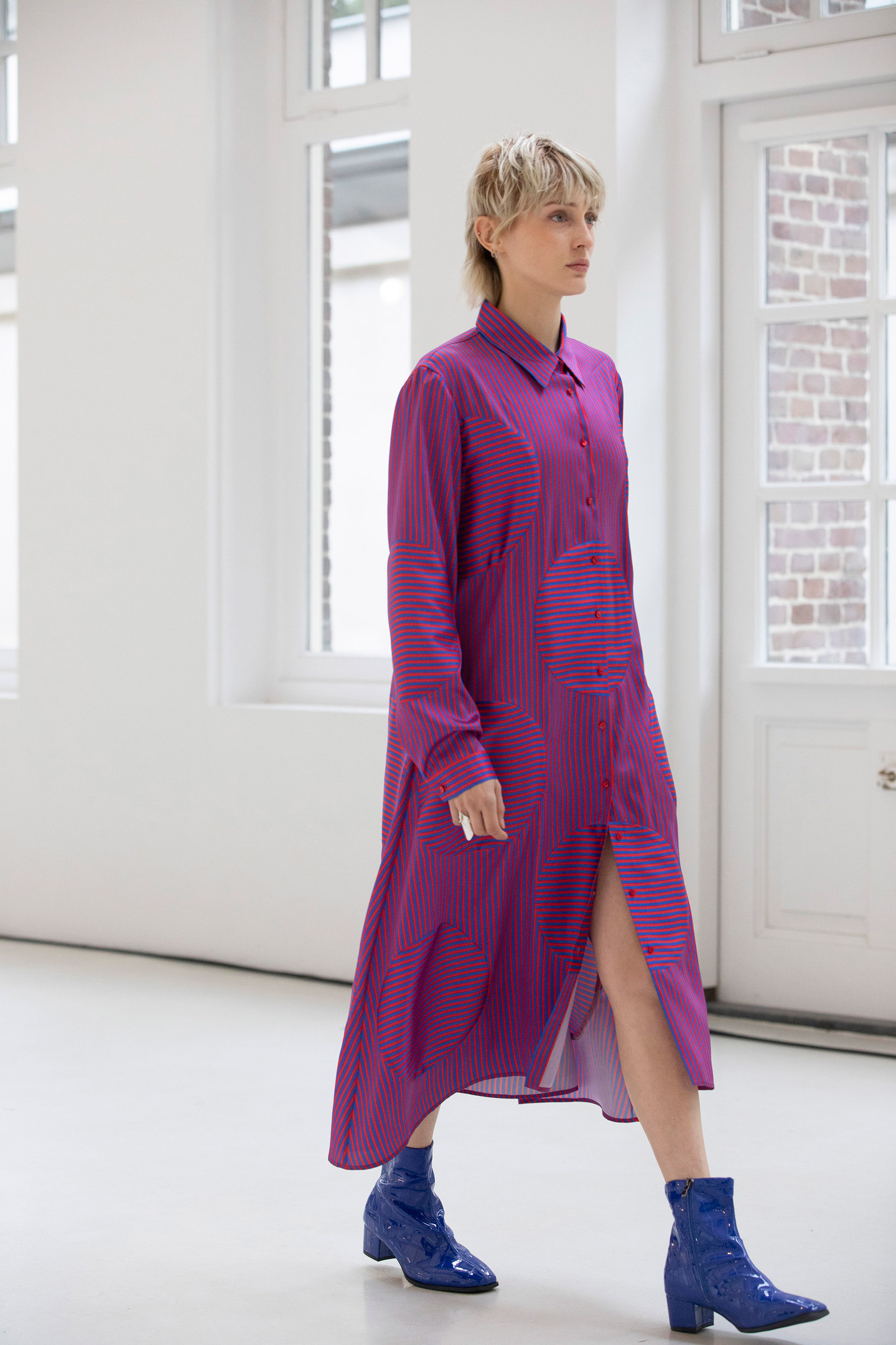 The Pull Up Dress is a long button up shirt dress with layers of 6 pleats on both sides of the placket. The wearer can open or close the pleats by pulling the cords on the inside.