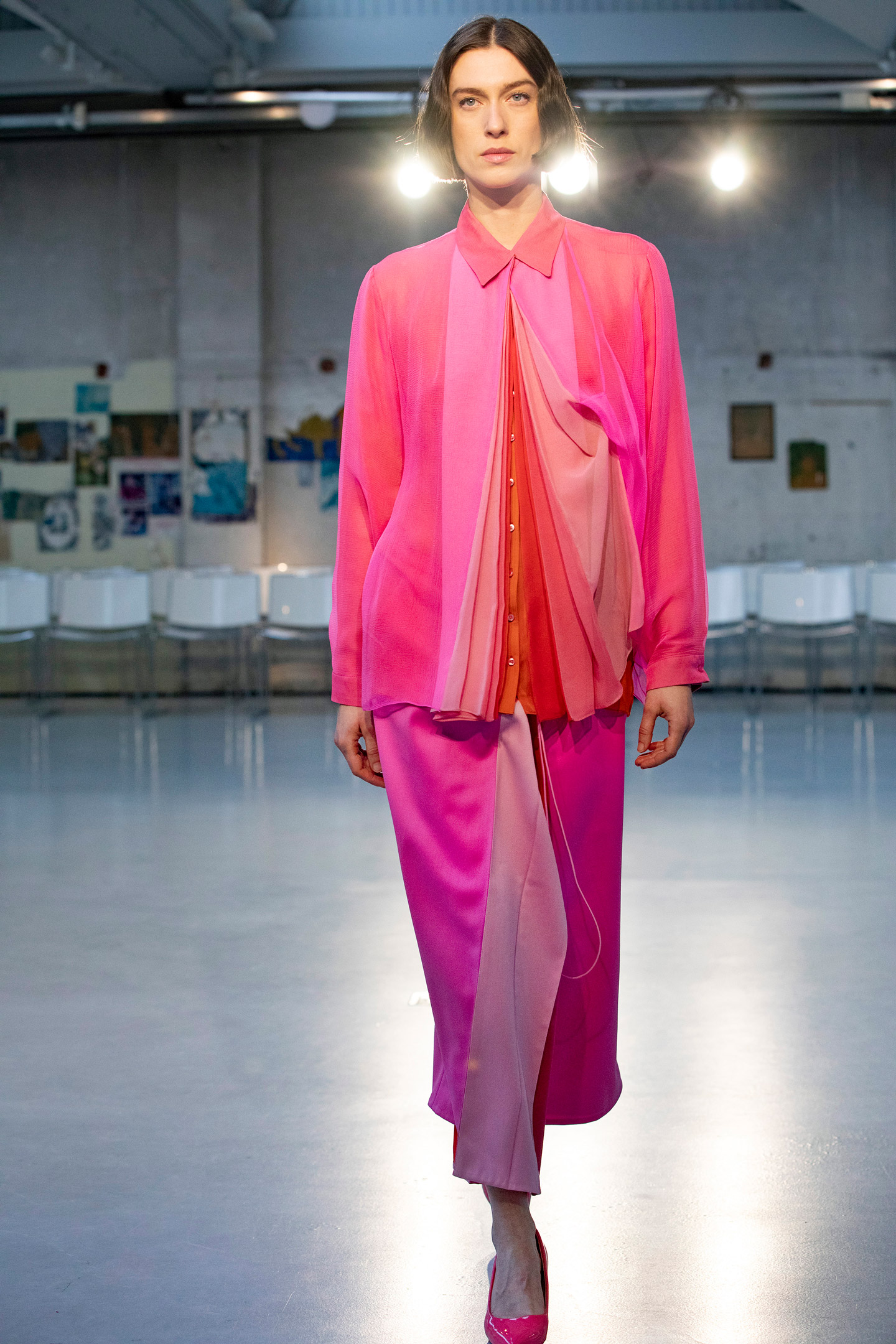 PLEATED PLACKED BLOUSE, PLEATED TROUSERS AND PLEATED SLEEVE JACKET